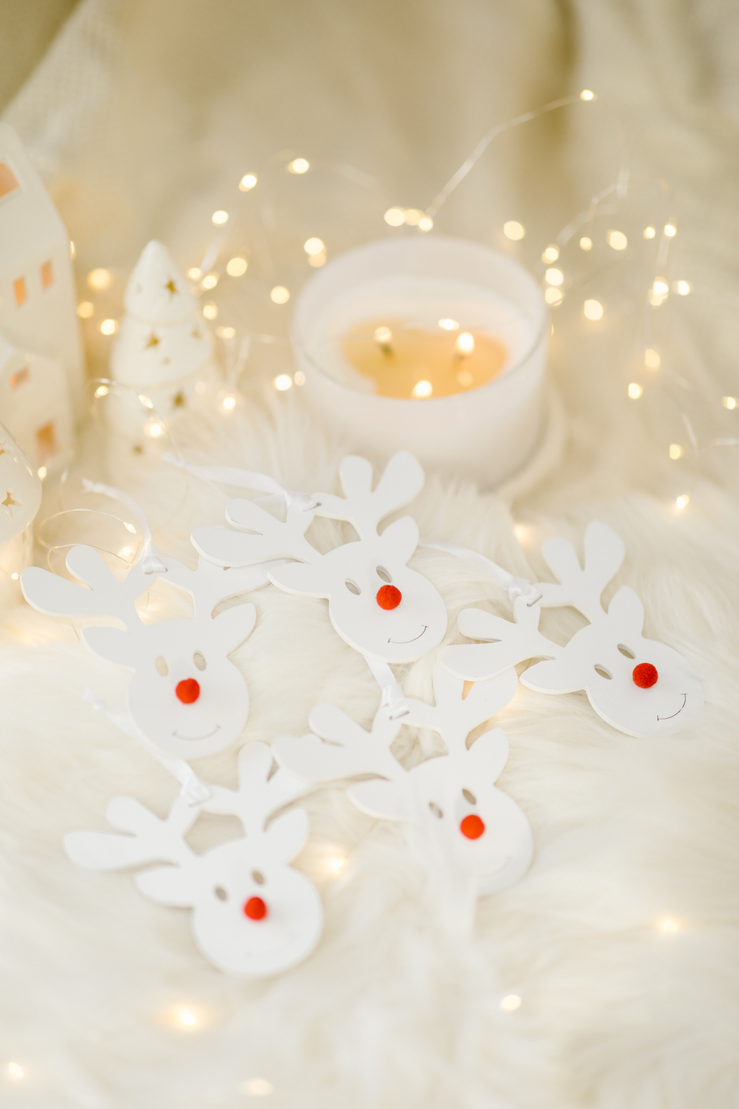 • Fiecare ren are o agatatoare din panglica de satin alba.